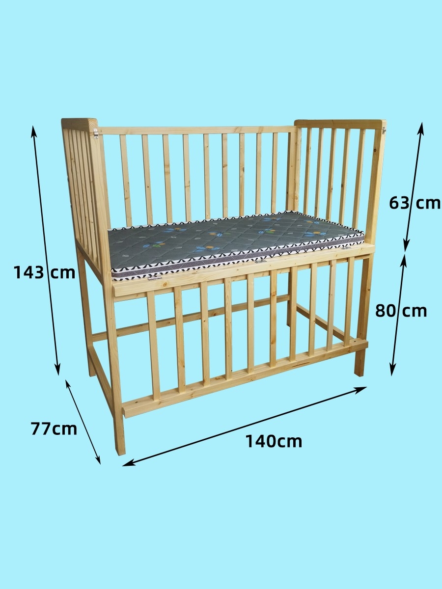 長140cm,寬77cm,高143cm,欄高63cm。一側(cè)護(hù)欄可開合,配備床墊。
